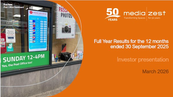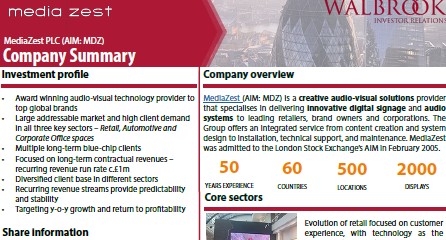 MediaZest is a creative audio-visual solutions provider that specialises in delivering innovative digital signage and audio systems to leading retailers, brand owners and corporations. The Group offers an integrated service from content creation and system design to installation, technical support, and maintenance. MediaZest was admitted to the London Stock Exchange's AIM in February 2005.