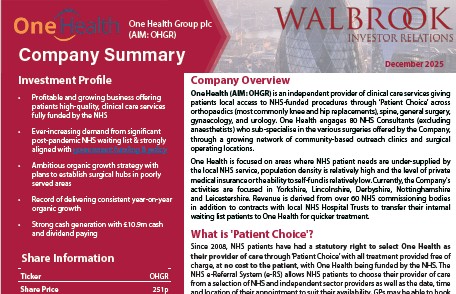 One Health is an independent provider giving patients local access to NHS-funded procedures through ‘Patient Choice’ across orthopaedics (most commonly knee and hip replacements), spine, general surgery, gynaecology, and urology. The Company works with over 100 professionals (surgeons and anaesthetists that are mostly employed by the NHS, on a subcontracted basis) across 9 independent hospitals and 37 outreach clinics.